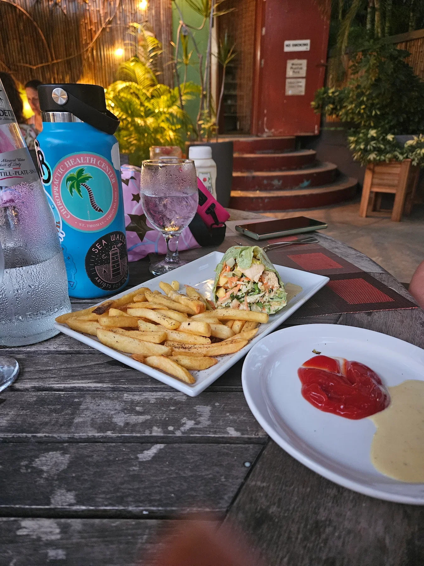 Our lunch menu offers a variety of options, from classics like wraps, juicy burgers, and sandwiches, to flavorful Caribbean plates like ginger wings and crunchy coconut chicken tenders. Experience the bliss of dining on our cozy and picturesque terrace, accompanied by tropical drinks or wine, as you take in the refreshing breeze and shade.